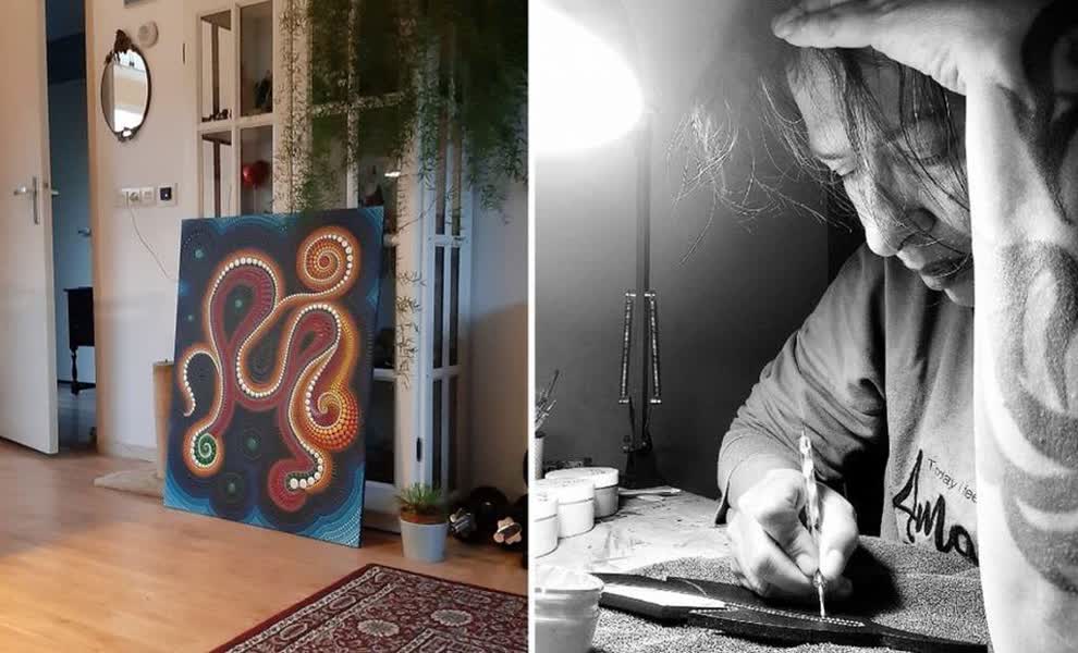 Voor de werken maakte ze gebruik van dotpainting, een schildertechniek met allemaal stippen. Dat de doeken haar veel waard zijn, komt ook omdat Meijerink een spierziekte heeft. “Het is voor mij heel moeilijk om zulke schilderijen nog te maken.”