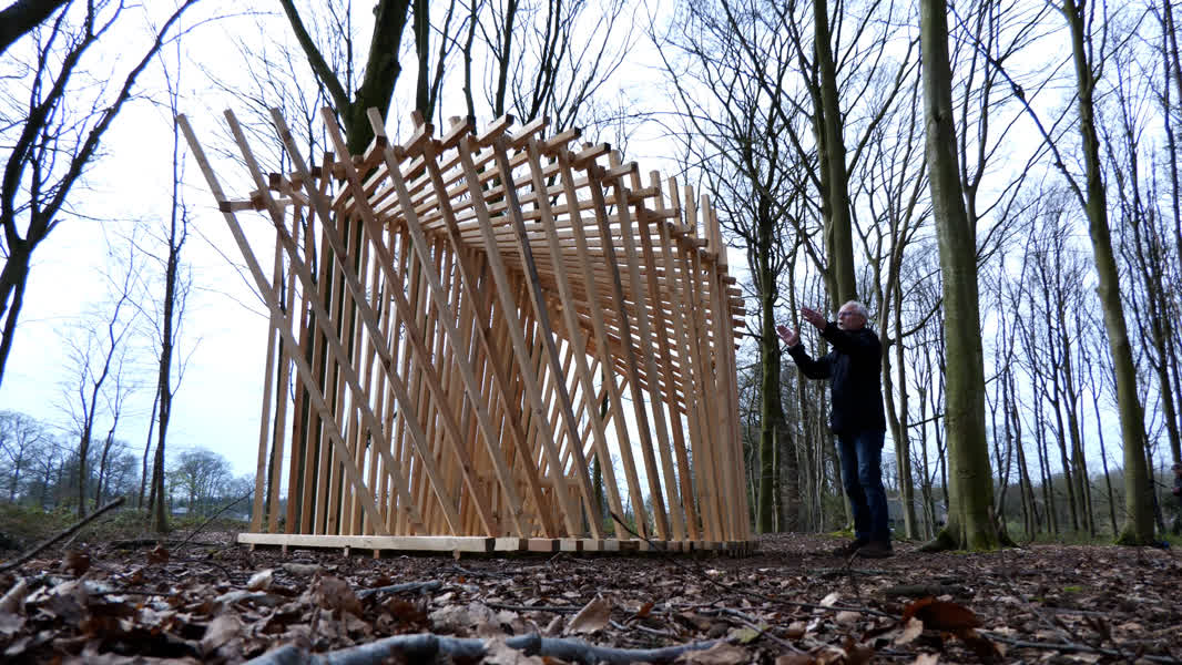 Een van de kunstwerken die op het landgoed staat, is van Nieuwenkamp. Hij haalde voor zijn werk inspiratie uit de zogeheten Engelse 'Follies'. Dit zijn gebouwen die vooral mooi moeten zijn, maar eigenlijk nergens toe dienen. "Ik heb iets gemaakt waar je in kunt, het moet iets zijn wat vragen oproept", licht Nieuwenkamp toe. "Ik heb een techniek gebruikt waarbij ritme en golvende lijnen belangrijk zijn. "