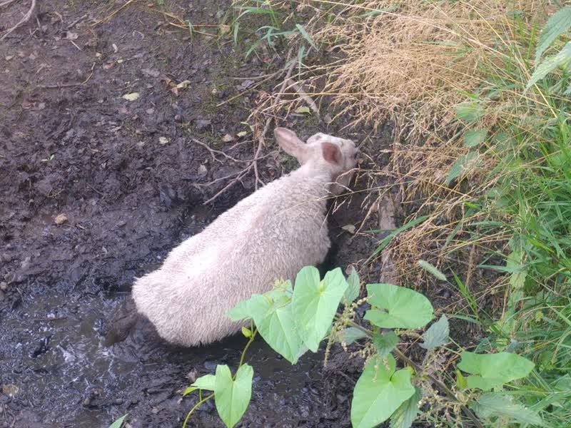 "In een sloot waar alleen nog maar blubber in stond zag hij onder een duiker een lammetje liggen", zo laat de Dierenambulance weten over de vondst van een buurtbewoner. "Het leefde nog, maar was zo ontzettend moe en zat diep weggezakt in de blubber." De man belde daarop de dierenarts en snelde zich terug naar de locatie. "Zonder zijn hulp hadden we het lam ook zeker niet gevonden, zo verborgen lag het en zo ver van de bestaande weg", aldus de Dierenambulance.
