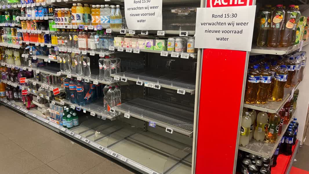 Tot die tijd blijft de vraag naar water in de winkels ongetwijfeld groot, dat merken ook de medewerkers van de Albert Heijn in Didam. Daar zijn ze druk bezig met het bijbestellen van flesjes water. "De vorige keer zeiden ze ook dat het een paar dagen zou duren, maar toen duurde het ook een week", zegt Zenyeb Metin, manager in opleiding bij de Albert Heijn in Didam. "Niet alleen aan de vragen, maar ook aan de blikken merk je dat de klanten denken: 'Waar is het water?'"