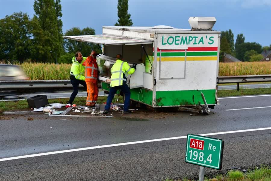 Door een kop-staartaanrijding is een loempiakraam vrijdagavond gekanteld op de snelweg A18 bij Doetinchem. Hoewel meerdere voertuigen beschadigd raakte, hoefde geen van de betrokkenen mee naar het ziekenhuis.