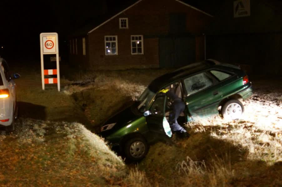 De man kreeg zijn auto zelf niet meer uit de sloot op de kruising van de Lageweg en de Turfweg. Omwonenden hoorden dat er iets niet klopte en waarschuwden de hulpdiensten. Zij hebben de man en zijn hondje uit de auto geholpen.