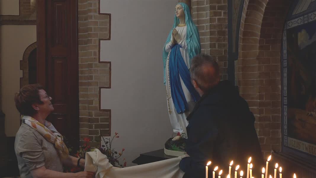 Eindelijk thuisDe viering van zondag stond helemaal in het teken van Maria, omdat het Maria Tenophemeling was en omdat Maria thuiskwam. Na de viering werd het beeld onthuld door de familie. "De afgelopen tijd is het beeld flink onder handen genomen", weet Waalderbos. "Het is gezandstraald en helemaal opnieuw beschilderd." Ook voor de familie was het een verrassing hoe het beeld eruitzag. "Het is prachtig", zegt Döppen. "Zo mooi is ze nog nooit geweest. En nu na al die omzwervingen is ze eindelijk thuis."