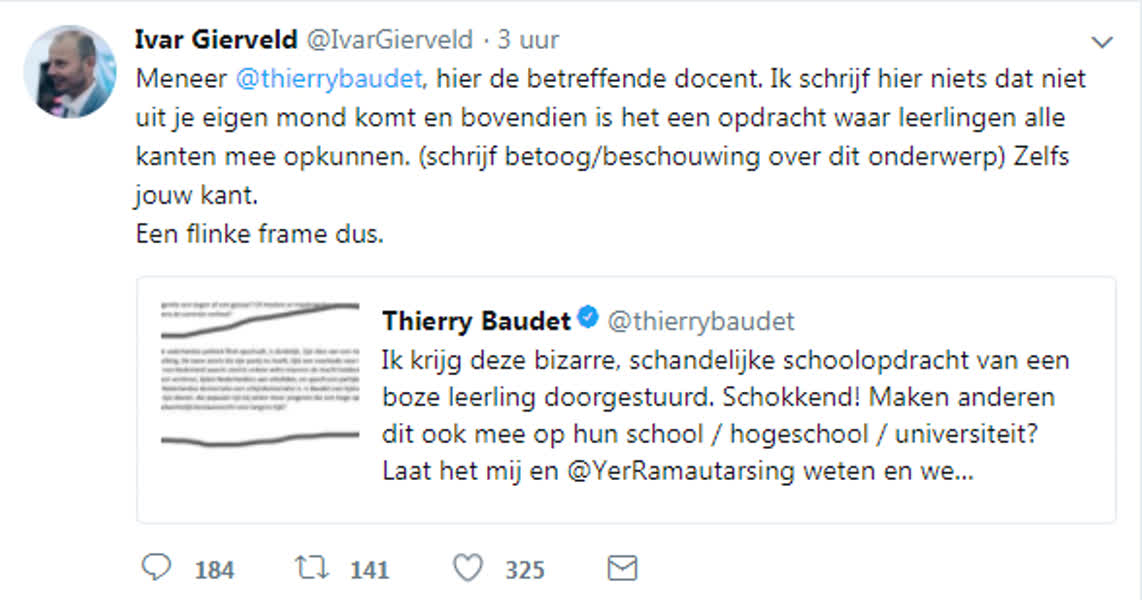 tweet op de uitspraken van de Groenlose school. “De school van de extreemlinkse haatdocent Ivar Gierveld blijft bij bizarre laster in een persbericht”, aldus Baudet. “Yernaz Ramautarsing (partijgenoot red.) en ik blijven bij het aanbod om langs te komen en met betreffende docent en schoolleiding in debat te gaan.”