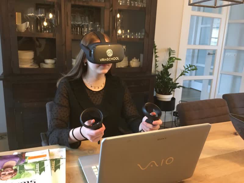 Het ziet er gek uit als de vijftienjarige Bibi thuis aan de keukentafel haar VR-bril opzet en haar hoofd van links naar rechts beweegt. In haar handen heeft ze twee controllers, waarmee ze dingen kan aanklikken en interactie heeft met haar medeleerlingen en haar leerkracht. “Het voelt echt heel bijzonder”, vindt Bibi. “Eigenlijk zit ik hier alleen in de kamer, maar ondertussen hoor ik wel stemmen naast mij en kan ik de mensen aankijken die ook in de virtuele omgeving zitten.” Het project bevindt zich nog in een pilotfase. Een groepje leerlingen maakt op dit moment gebruik van de VR-brillen en experimenteert hiermee. “Als je eenmaal zo’n bril hebt op gehad, dan word je echt enthousiast”, zegt leerkracht Sander Esselink. “Het is een ander soort ervaring dan gewoon achter je laptop zitten.”