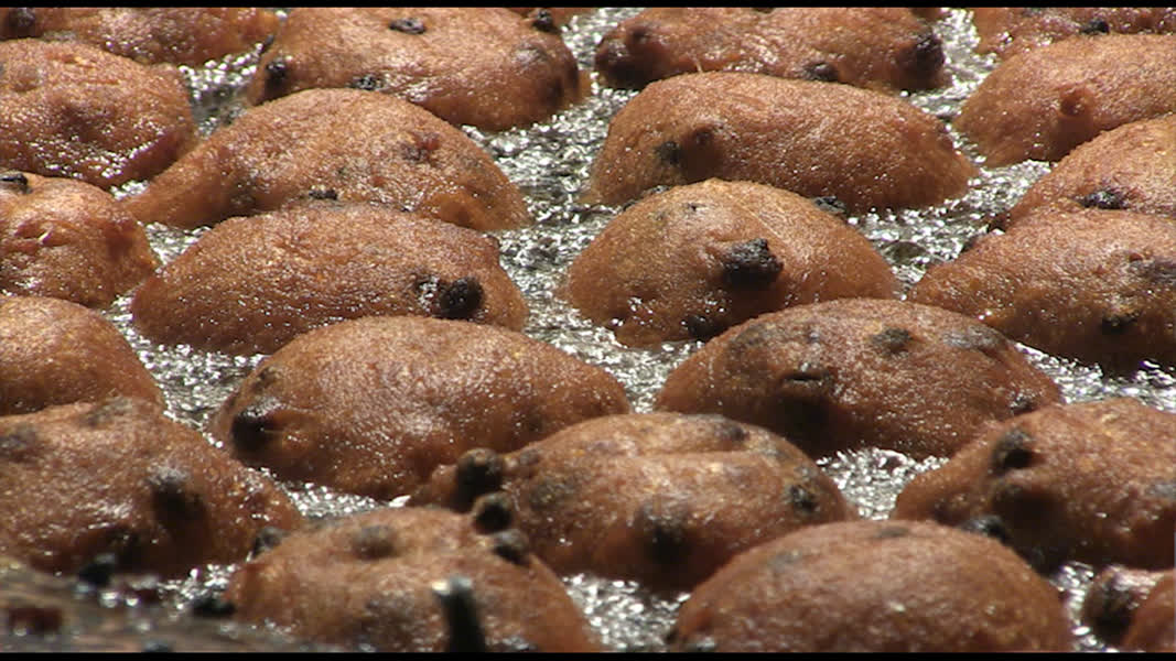 Niet alleen oliebollen worden verkocht, ook andere typische oudjaarsdag hapjes worden gemaakt. "Als je twee oliebollen verkoopt, verkoop je één appelbeignet ongeveer. Sinds een paar jaar hebben we ook mini-appelbeignets. Zo'n grote appelbeignet is altijd nog wel een flinke boterham, maar zo'n mini-appeltbeignetje dan denken de mensen 'dat hapt zo lekker weg en is ook niet zo slecht', dus die gaan steeds beter eigenlijk."