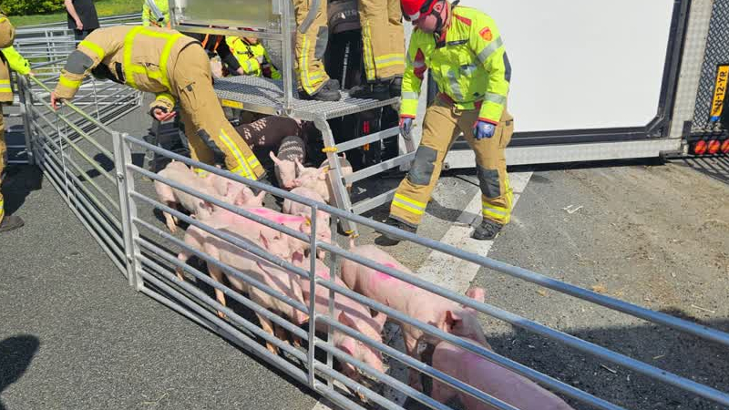 A18 deels afgesloten door gekantelde vrachtwagen met biggen bij Doetinchem