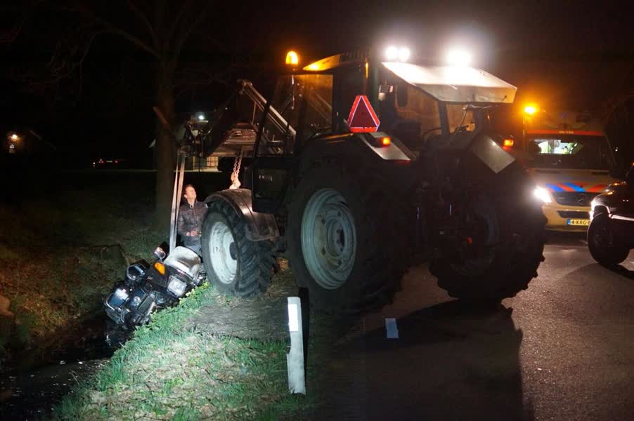 Een boer uit de buurt heeft met een tractor de motor uit de sloot gehaald en daarna bij een buurman gestald. Daar is het voertuig opgehaald door een berger.