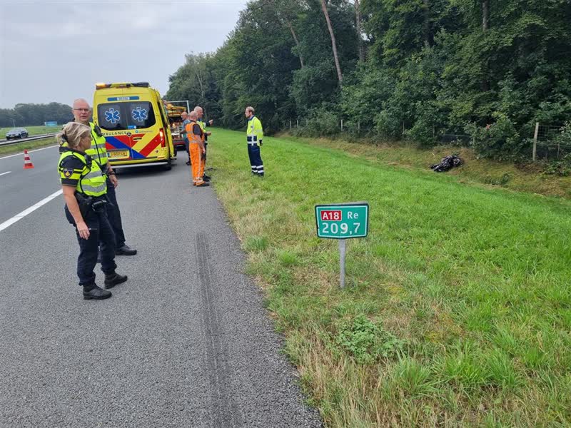 Een motorrijder is zaterdagochtend gewond geraakt bij een ongeval op de snelweg A18 bij Westendorp. De man werd van zijn voertuig gelanceerd door een omhoog staande putdeksel.