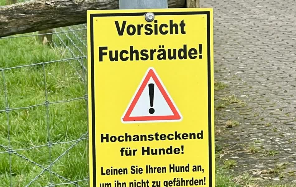 'Pas op voor vossenschurft! Zeer besmettelijk voor honden! Houd uw hond aan de lijn om het niet in gevaar te brengen!', valt er op het gele bordje te lezen. Dat hondeneigenaren hierop moeten letten, vindt Joost van Herten van de Koninklijke Nederlandse Maatschappij voor Diergeneeskunde niet gek. “Vossenschurft komt ook in Nederland weleens voor. Je ziet het hier en daar wel, vooral in de grensregio.”