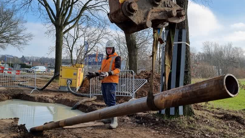 Een lastige klus deze week bij de reconstructie van de Zeddamseweg tussen Etten en Terborg. Een pijp...