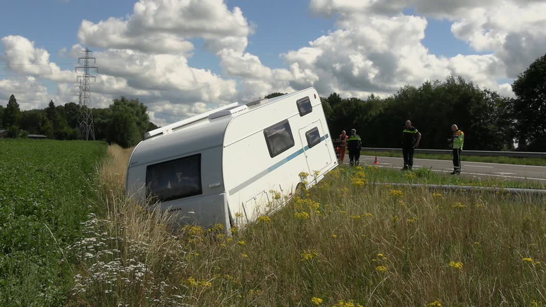 Een gloednieuwe caravan is zondagochtend in een sloot naast de snelweg A18 tussen Wehl en Didam terecht gekomen. De sleurhut was twee dagen daarvoor gekocht door de eigenaar.