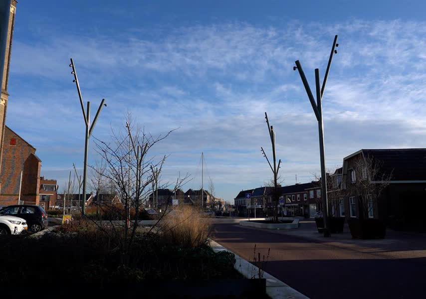 “De witte bakken gaan we inplanten met de zogenaamde prairiebeplanting”, vertelt wethouder Oscar van Leeuwen. “Die geven een heel kleurrijk beeld en als we in de lente de planten op zien komen, dan zul je zien dat hier heel veel insecten komen. Daar stimuleren we de biodiversiteit mee.” Een van de meest besproken onderwerpen onder de inwoners zijn de nieuwe grote lantaarnpalen. Voor inwoner Karin van der Velden waren de lantaarnpalen even wennen. “Ik dacht eerst: jeetje, wat hebben ze daar ingezet”, vertelt van der Velden. “Maar als je het deze zomer gaat zien, met de bomen in het groen dan denk ik toch dat het heel mooi is.” Wethouder van Leeuwen geeft aan dat de lantaarnpalen overdag nu erg opvallen omdat er geen beplanting omheen staat. “In de avond kunnen we straks heel mooi de kerk en de planten die hier komen te staan belichten, dat geeft een heel mooi sfeer beeld. Daarom is er gekozen voor deze toch wel wat opzienbarende lantaarnpalen.”