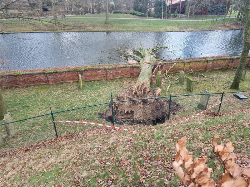 In Groenlo is donderdagochtend een grote boom omgewaaid op een Joodse begraafplaats. Daarbij is een graf geraakt, dat daardoor is ontzet. De boom heeft ook een muurtje vernield en is deels in de gracht terechtgekomen. Veel losgekomen delen die daardoor in het water terecht zijn gekomen, zijn in de loop van de dag verwijderd.