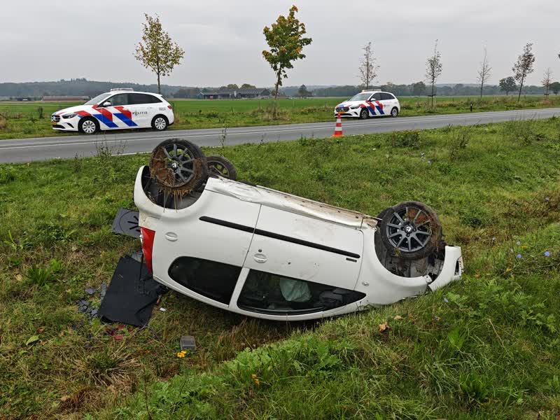 Een automobilist is zaterdagmiddag op de Burgemeester van Breemenweg in Azewijn met zijn auto op de kop in een sloot beland. De bestuurder verloor de macht over het stuur, waardoor het voertuig uit de bocht vloog.