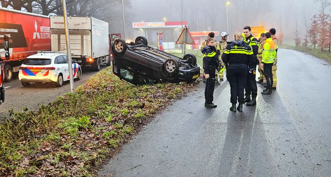 Een automobilist is woensdagochtend met de schrik vrijgekomen na een aanrijding met een vrachtwagen, net buiten Drempt. Bij het ongeval belandde de personenauto op zijn dak in de berm.