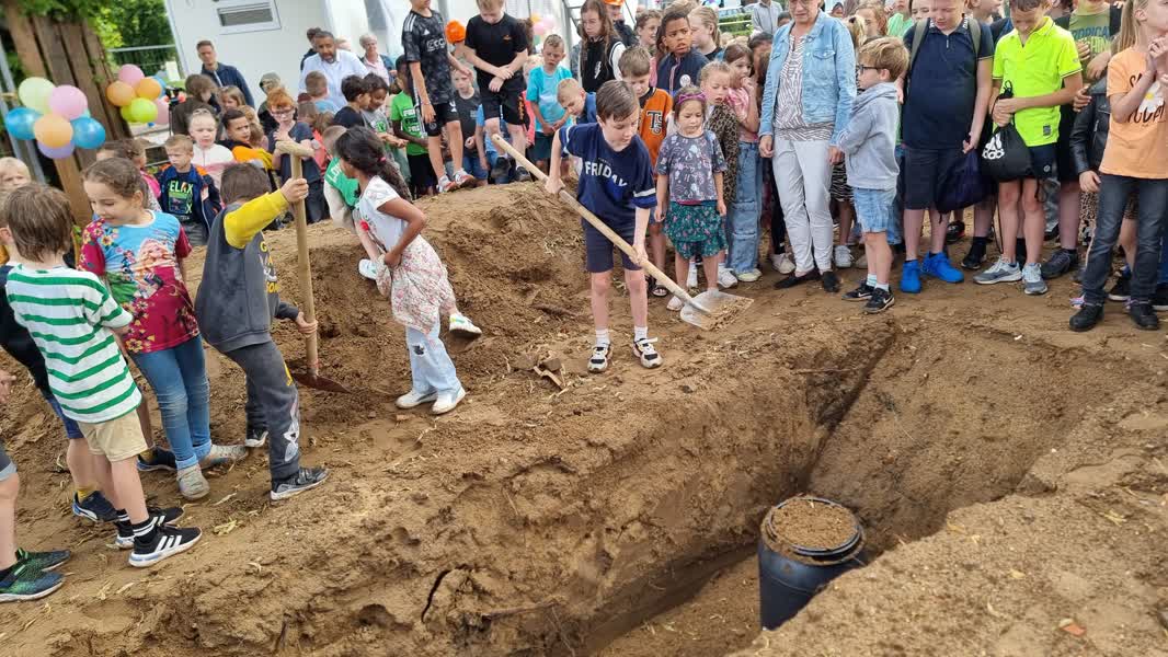 “We hebben heel veel kunnen regelen voor vandaag, een gat voor de tijdscapsule en wat lekkers. Alleen het weer kunnen we niet regelen, dat is jammer,” zegt Geron Verdellen, directeur van het bouwbedrijf dat de school bouwt. Net op het moment dat de plechtigheden beginnen, komt het met bakken uit de hemel. Kinderen proberen te schuilen onder de bomen. Een enkeling was slim genoeg om een jas mee te nemen. Die wordt nu ingezet als paraplu om samen met vriendjes en vriendinnetjes te schuilen. Gelukkig is de bui van korte duur, al staan de kinderen wel te rillen als verzopen katjes.