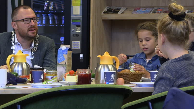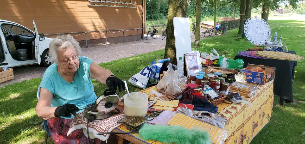 Ze verwelkomt de nodige belangstellenden bij haar kniepertjes, jam en fruit. “Dat bunt proem’n van de eigen boom”, zegt ze tegen een klant. “Wat ze kost? Fruit is veur een vrijwillige bijdrage, maor neet te krap, hè? Het is veur het goede doel.”