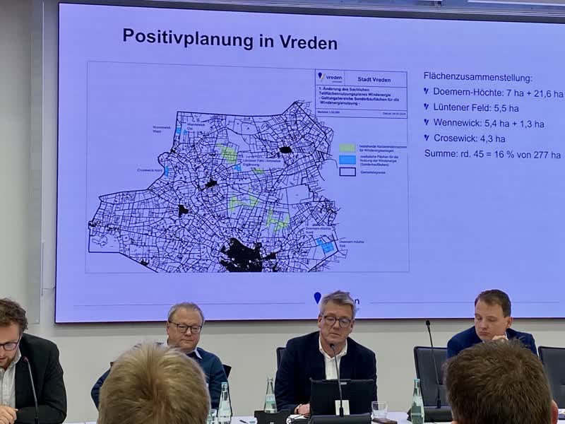 De Vredense gemeenteraad wil méér doen voor klimaatverandering en voor de Duitse economie. Ze heeft daar veel voor over. Het komt neer op dat Vreden méér dan wat Berlijn stelt, de vereiste twee procent van het grondgebied van de gemeente, vol wil zetten met 250 meter hoge windmolens. De zogenaamde concentratiegebieden staan reeds vol, maar er is nog plek vlak bij de Nederlandse grens en in ‘Naturschutzgebiet’—beschermde natuurgebieden die ook doorlopen in Nederland en waar weinig mensen wonen. Er zit zelfs een windturbine met een wiekhoogte van 267 meter bij.