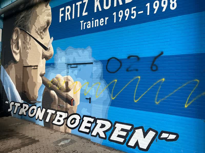 De muurschilderingen op stadion De Vijverberg in Doetinchem zijn beklad met het kengetal van Arnhem en de clubkleuren van Vitesse. Op de kunstwerken waar onder andere Fritz Korbach, Eric Viscaal en John Leeuwerik te zien zijn, hebben vandalen strepen in het geel en zwart gezet.
