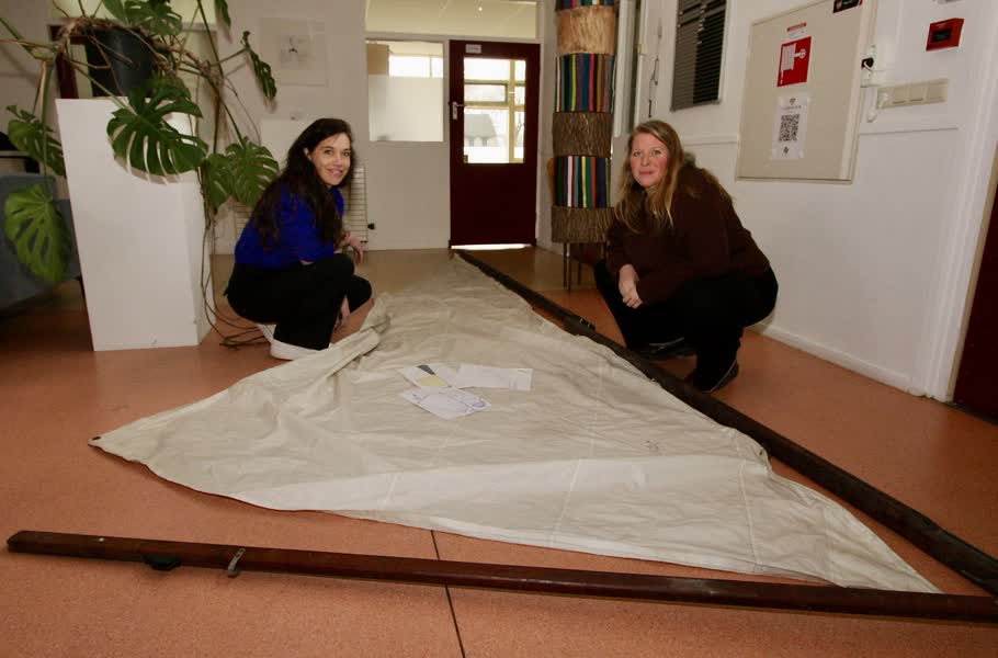 Haar Nederlandse kunstmaatje Tiki Tangelder deelt de echo van Maria’s herinneringen van het meer en haar vader. “Mooi dat water en de wind bepaalde verlangens naar vrijheid oproepen”, haakt ze in op Maria’s verhaal. In het zeildoek zullen straks weggeknipte silhouetten van vogels te zien zijn. Ze staan symbool voor de vrijheid, duiven staan voor de vrede. Het woord ‘borduren’ valt ook, want het voorbereidend werk is nog niet afgerond. “Kunst ontwerpen is een proces waar je doorheen gaat”, verklaren beide kunstenaars. “Het is mooi om dat nog een beetje vrij te laten.