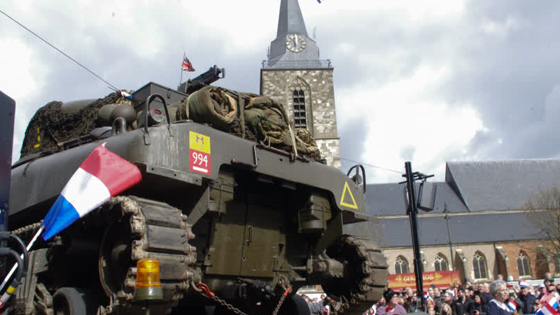 Tijdens een optocht van legervoertuigen door het centrum van Winterswijk ter gelegenheid van 80-jaar...