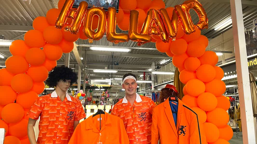 “Het is oprecht echt een gekkenhuis”, zo schetst Lars Peters, eigenaar van Festival Feestartikelen. “Het is vanavond in Dortmund en het is anderhalf uur rijden hier vandaan en we zitten mooi aan de grens, dus de klanten komen echt overal vandaan.” De Oranjegekte begon woensdagochtend al vroeg voor Peters: “Ik werd uit mijn bed gebeld door Tinus Hoekstra, de volksartiest, die nog oranjehandel nodig had dus het was gelijk al boem gas d’r op.”