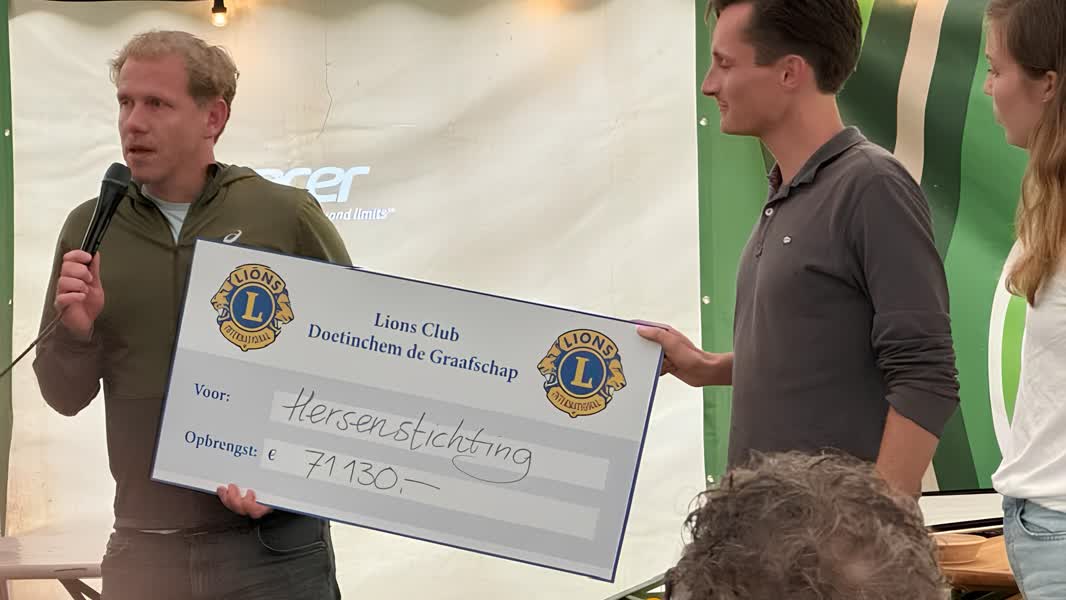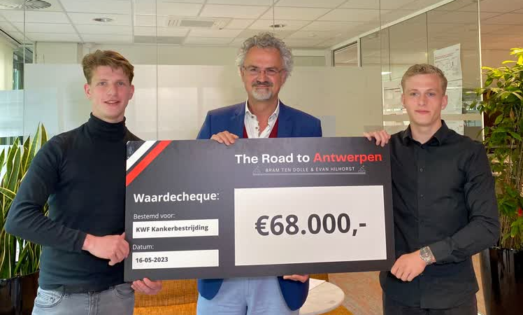 Bram ten Dolle en Evan Hillhorst hebben dinsdag een cheque van 68.000 euro overhandigd aan KWF. De j...