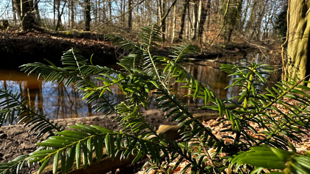 Omroep Gelderland-verslaggever Laurens Tijink. Langs de beek de Slinge bij Winterswijk blijkt de oer-Hollandse taxus zelfs nog op meerdere plekken voor te komen. In de van oorsprong vaak natte bossen heeft de natuur altijd grotendeels haar eigen gang kunnen gaan.