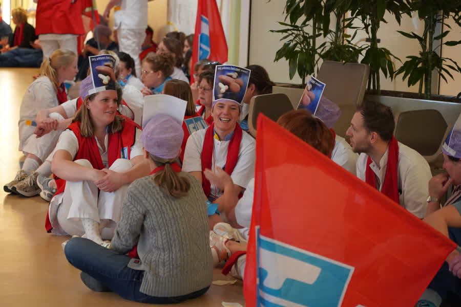 "In de coronatijd werd er voor het ziekenhuispersoneel geklapt, helaas bleef het daar bij", aldus Jordy Kok, verpleegkundige in het Slingeland ziekenhuis. "Wij hopen dat onze cao passend is bij de waardering die wij hopen te krijgen." De werknemers leggen daarom hun werk op een leuke manier neer. De stakers gaan in de hal van het ziekenhuis 'bij de pakken neerzitten', dit is volgens hun een teken dat de huidige werkdruk en loon niet langer hanteerbaar is. Ook heeft het personeel hun werkkleding aan een waslijn bij de hoofdingang gehangen met de boodschap: 'de zorg wordt uitgekleed'.