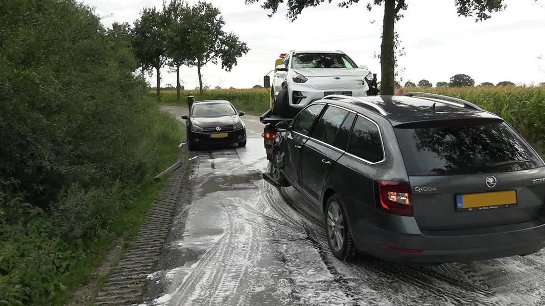 Vier voertuigen zijn dinsdagavond zwaar beschadigd geraakt in het buitengebied van Azewijn. Door een oliespoor verloren de bestuurders de macht over het stuur, wat zorgde voor een chaos op en naast de weg.