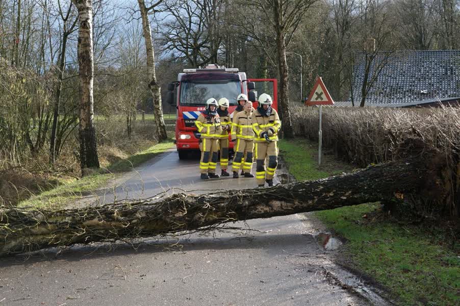 Het gevaarte kwam dankzij de harde wind omstreeks 14.45 uur naar beneden en viel dwars over de weg. Het verkeer op het buitenweggetje liep daardoor enige tijd vast.