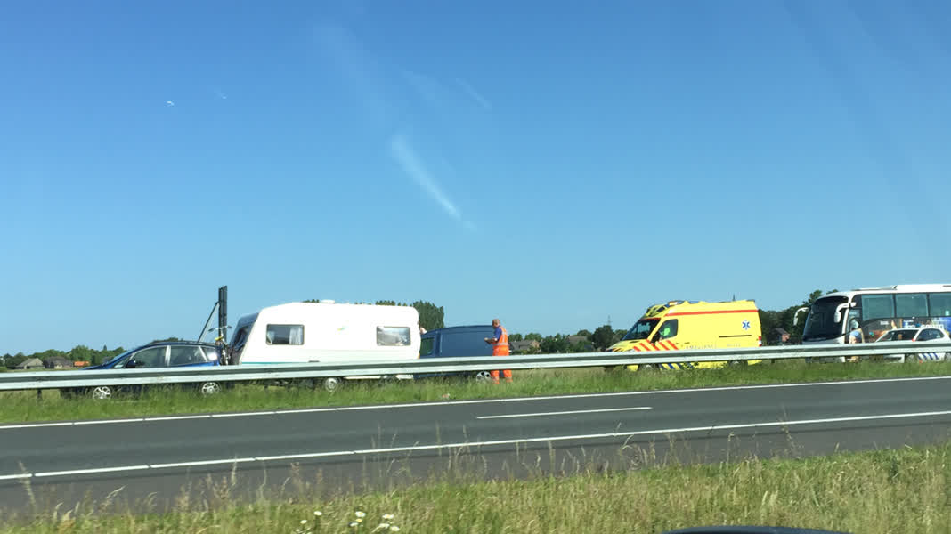Op de linker rijbaan richting knooppunt Oud Dijk is een bestelbusje ingereden op een auto met caravan. Hierbij is de bestelbus voor een deel in de caravan verdwenen. Mogelijk zag de bestuurder van de blauwe bestelbus de caravan te laat remmen.
