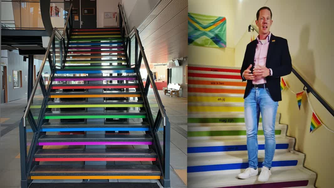 Aan het einde van het vorige schooljaar werd een eerste regenboogtrap onthuld op de middelbare school in Winterswijk. "Met de bedoeling uiting te geven aan de boodschap dat iedereen bij ons welkom is", schrijft de school op Facebook. "Daarom is op die trap ook de tekst gekomen: 'Ik ben wie ik ben en jij mag zijn wie je wil zijn'." Die trap leverde gesprekken op over thema's als seksualiteit, discriminatie en jezelf kunnen zijn, zegt de school. "Maar we merkten dat er een ongewenst bijeffect ontstond: dat het voor sommige leerlingen een keuze werd: 'over welke trap ga je naar boven?'.