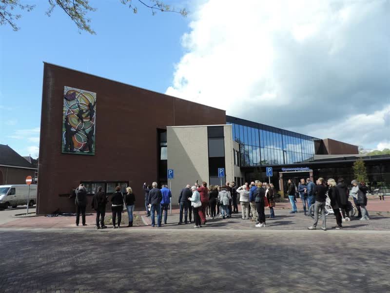 Wethouder René Hoijtink onthulde het kunstwerk. Op de Facebookpagina van de gemeente reageren inwoners positief op het kunstwerk aan de gevel van het pas verbouwde gemeentehuis.