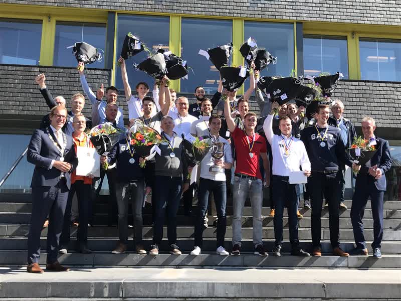Na de huldiging werd de selectie samen met burgemeester en wethouders vereeuwigd op de trappen voor het stadhuis. De atleten waren in betere staat dan de beker, die had de reis naar vanuit Groningen en de bijbehorende festiviteiten niet volledig overleefd.