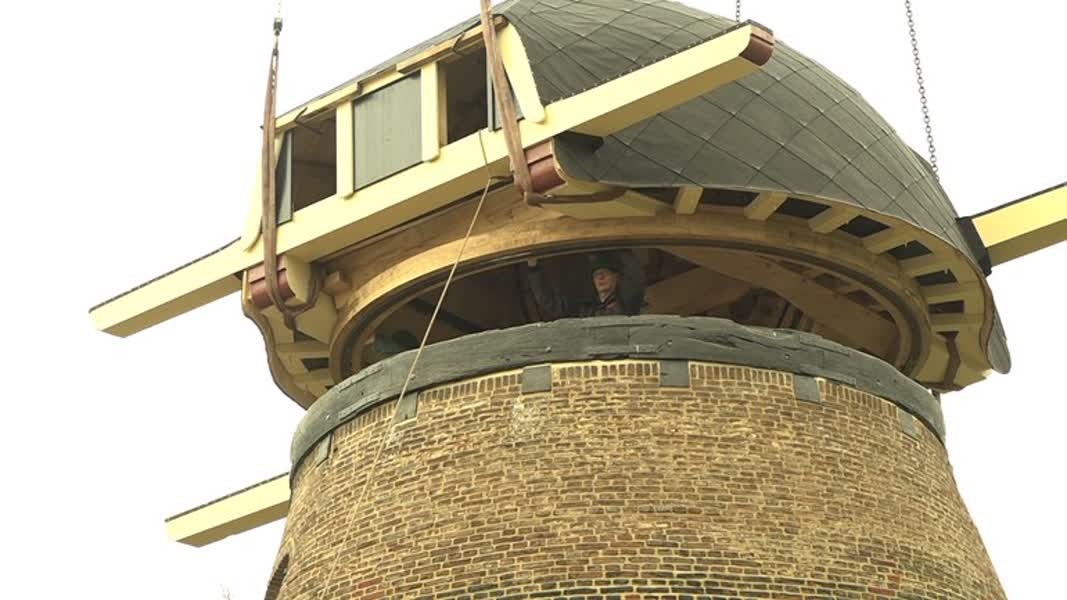 De oude Coopsmolen in Zelhem heeft na tachtig jaar weer een dak. De nieuwe kap werd vrijdag onder het toeziend oog van veel belangstellenden op het monument geplaatst.