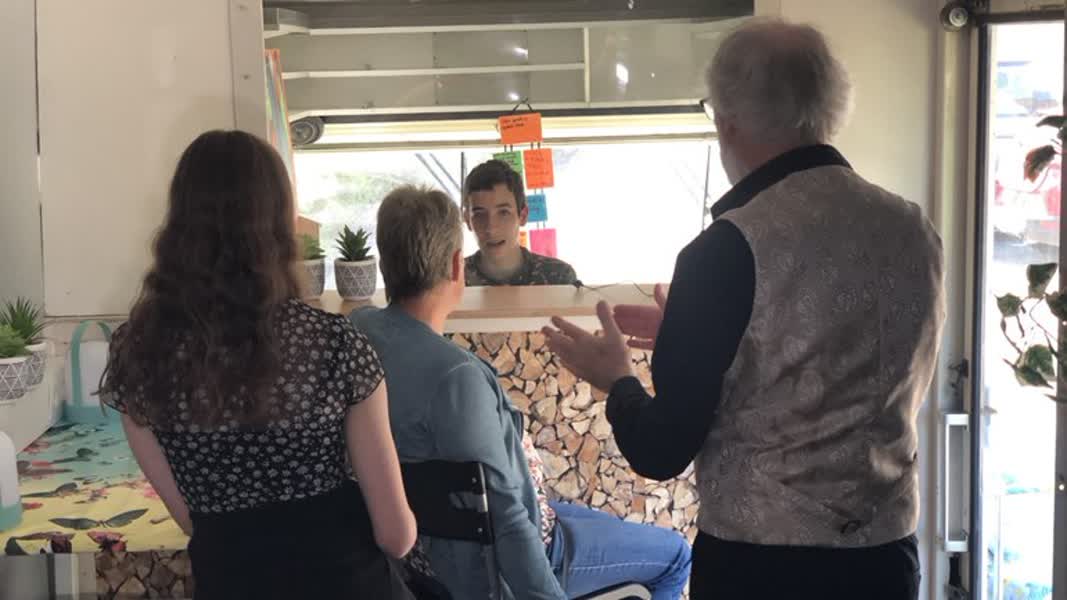 "Ha jongen, wat heb je een mooi t-shirt aan!", roept de moeder van de 14-jarige Wouter, die vanwege zijn autisme sinds eind februari bij zorginstelling De Lichtenvoorde in Groenlo woont. Ook zijn vader en 18-jarige zus kijken naar hem, vanachter het plexiglas. En de hond van het gezin is mee. De wagen, in bruikleen van de Zwarte Cross, is namelijk gepimpt en 'coronaproof' gemaakt. Wouter