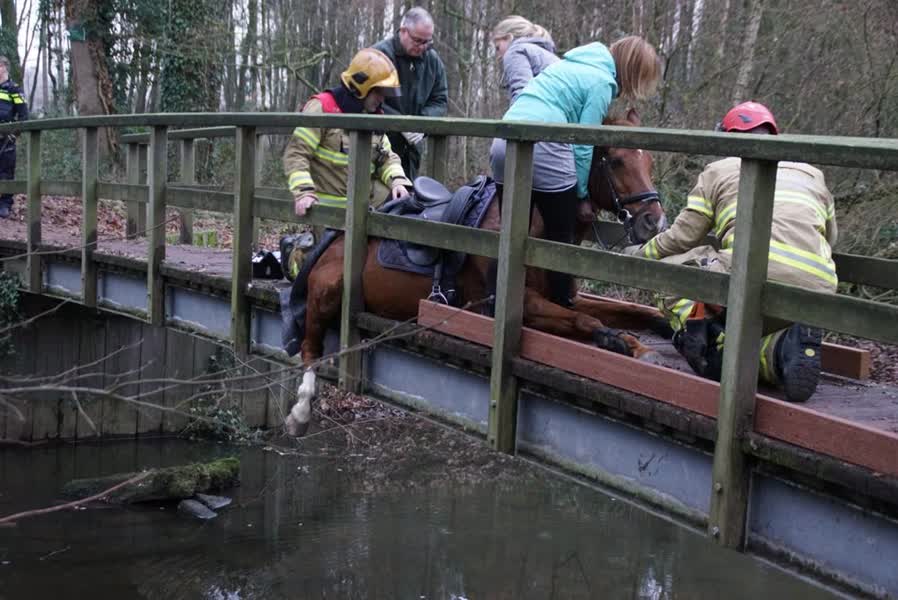 Een aantal ruiters ter paard willen het bruggetje oversteken nabij de Oude Bocholtsebaan. De eerste ruiter komt ten val, doordat het paard uitgleed over de gladde brug. De ruiter kon op tijd van het paard afspringen. Het paard kwam door de val klem te zitten met een been en moest door de brandweer worden bevrijdt. Een dierenarts heeft het dier ter plekke verdoofd en behandeld.