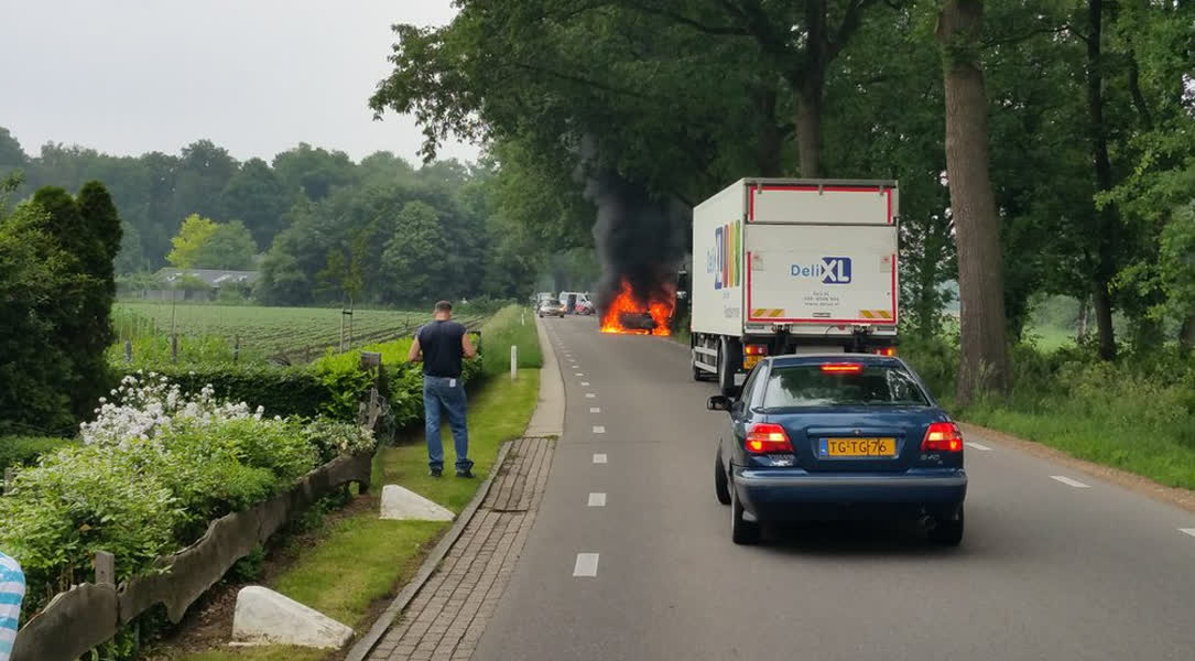 Hulpdiensten werden omstreeks 14.00 uur gealarmeerd voor een autobrand. Bij aankomst vlogen de metershoge vlammen al uit het voertuig. Het is niet bekend of er gewonden zijn gevallen.
