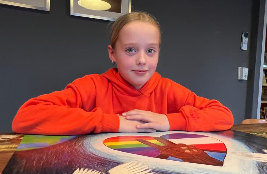 Op de tekening van Pleun zijn naast een wereldbol en vredesduiven ook twee vlaggen in een hart te zien. “De vlag van de regenboog en de Nederlandse vlag”, vertelt Pleun, die de Nederlandse vlag op de kop tekende. “Dat was eigenlijk niet de bedoeling, maar ik ben zelf ook wel voor de boeren. Ik had de vlag ook al zo vaak zo gezien, dus was ik er al aan gewend.” Deze onbedoelde boodschap draagt volgens Bussink bij aan het bijzondere ontwerp. “Ik vond het een geweldige tekening, vanwege die loyaliteit. Ook met de regenboogvlag voor de LHBTI, waar zoveel on-loyaliteit over is. Er worden trappen en bankjes zwart geschilderd, omdat je in Nederland niet mag laten zien dat je homo bent.” Hij vindt het knap dat Pleun dat heeft verwerkt in haar tekening: “Dat je dat soort dingen durft te tekenen en kunt tekenen, dat vind ik fantastisch.”