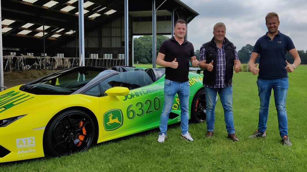 De bekende weerboer Gerrit Vossers kijkt met een gevoel van trots naar de 'Poah-Lamborghini' van Frank Huijink uit Doetinchem en Marwin Melis uit Arnhem. Het duo gaat met de supercar meedoen aan The Challenge 2021, waarbij ze duizenden kilometers door Europa afleggen.