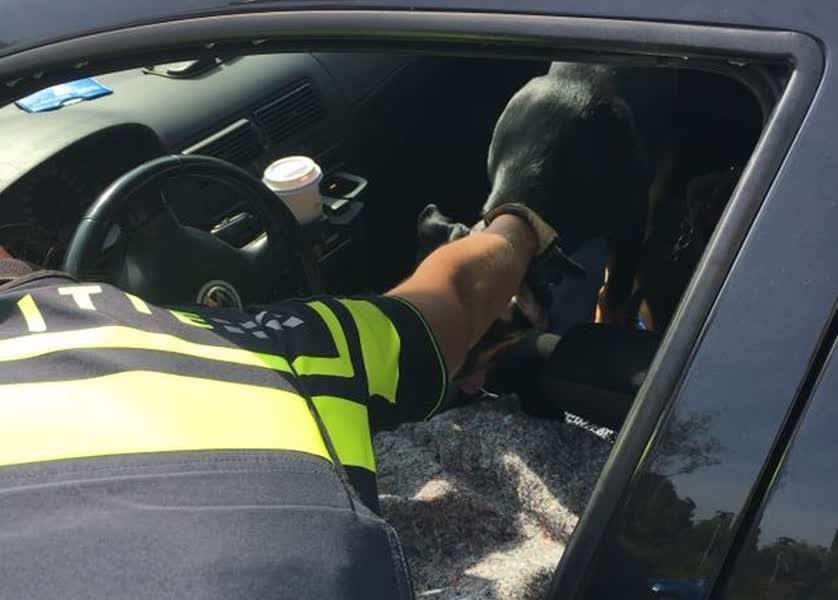 Het lukte de ter plaatse gekomen agenten niet om de auto open te krijgen zonder schade aan te richten. Daarna is er een ruit ingetikt, om de hond eruit te krijgen. Het beestje kreeg een plekje in de schaduw en een bak water. De eigenaresse kwam even later bij haar auto en er is proces-verbaal tegen haar opgemaakt.