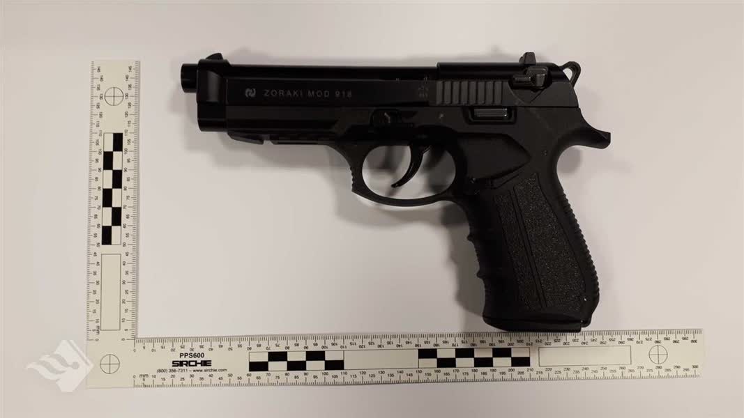 Na onderzoek van de politie bleek het om een alarmpistool te gaan. Dat is een wapen dat op een echt pistool lijkt, maar geen kogels afvuurt en slechts een harde knal geeft. Het is nog onduidelijk wat de verdachten met het alarmpistool van plan waren.