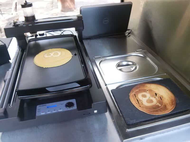 “Het komt van een kickstartersproject uit Amerika”, vertelt kok Rob Weijers. Met de pannenkoekenprinter kunnen speciale vormen en kleuren worden gemaakt. “Het duurt ongeveer tien minuten, maar het ligt aan de complexiteit van het ontwerp.” Zijn geprinte pannenkoeken dan wel net zo lekker? “De printer doet helemaal niets met de smaak. Wat je erin doet, is wat eruit komt.”