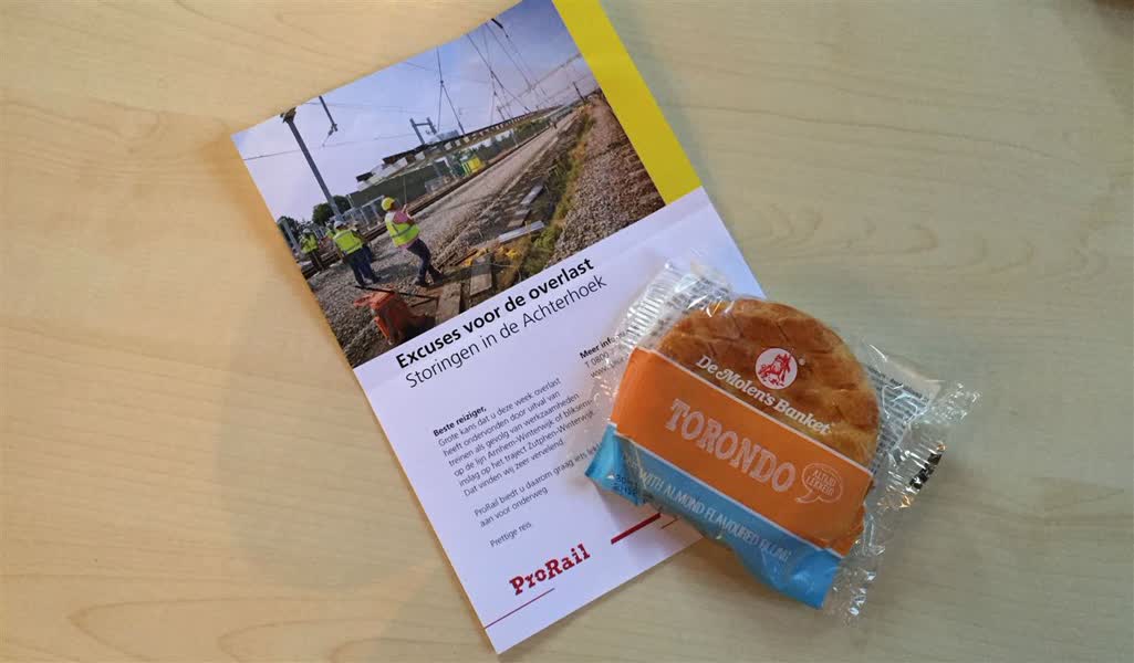 Donderdagmorgen deelden medewerkers van ProRail koekjes met een bijgevoegde brief uit. ‘Excuses voor de overlast’, staat opgeschreven in het briefje. De afgelopen dagen reden er nauwelijks treinen op het traject van Arnhem naar Winterswijk. 'ProRail biedt u daarom graag iets lekkers aan voor onderweg.'