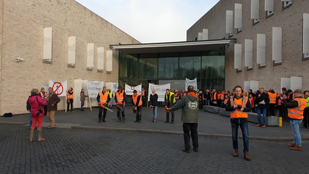 Inwoners van Bronckhorst protesteren dinsdagochtend tegen de mogelijke komst van twaalf windmolens. Het voornemen staat in de Routekaart Energieneutraal Bronckhorst 2030, waarover de gemeenteraad donderdag een besluit neemt.