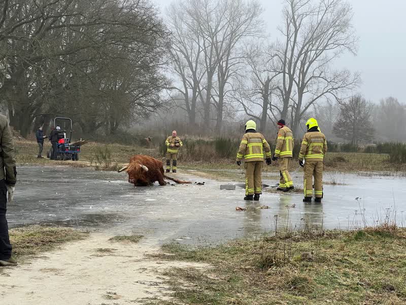 Schotse hooglander door brandweer van ijs gered in Doetinchem