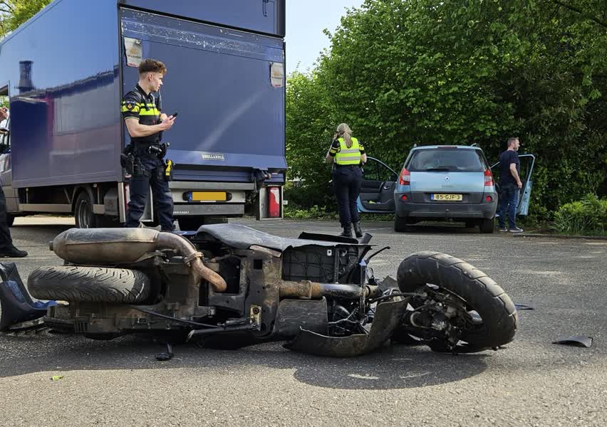 De schade aan de scooter is behoorlijk groot en het voertuig is tijdelijk ergens gestald. Het busje liep minimale schade op bij het ongeval en de bestuurder kon zijn weg dan ook vervolgen.