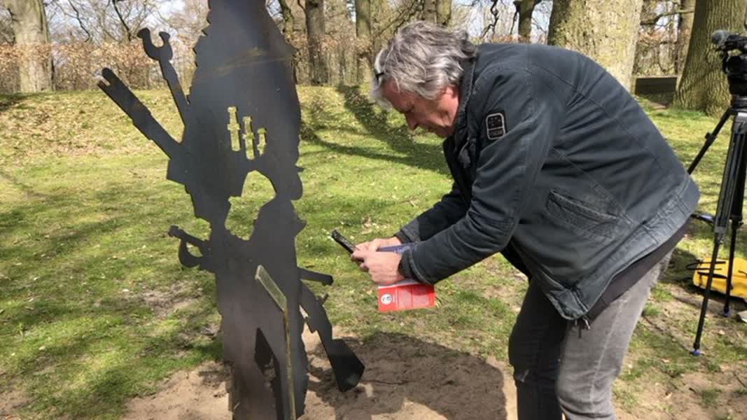Willem te Molder buigt voorover op de wal bij De Halve Maan in Groenlo en scant met zijn telefoon de QR-code bij 'Massimo'. Het uit plaatijzer gesneden silhouet is één van de acht fictieve bewoners van Groenlo in 1627, waarbij ieder silhouet een eigen verhaal vertelt.